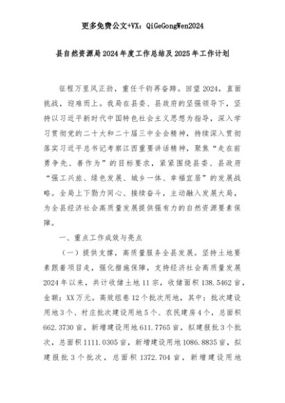 【七哥公文】2025年:县自然资源局2024年度工作总结及2025年工作计划+更多免费公文+VX:QiGeGongWen2024+更多免费公文+VX:QiGeGongWen2024