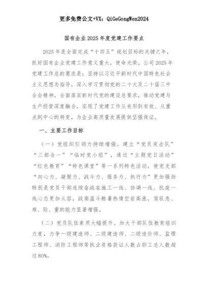 【七哥公文】2025年:国有企业2025年度党建工作要点+更多免费公文+VX:QiGeGongWen2024+更多免费公文+VX:QiGeGongWen2024