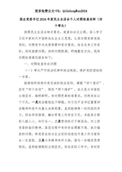【七哥公文】2025年:国企党委书记2024年度民主生活会个人对照检查材料(四个带头)+更多免费公文+VX:QiGeGongWen2024+更多免费公文+VX:QiGeGongWen2024