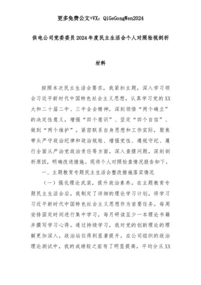 【七哥公文】2025年:供电公司党委委员2024年度民主生活会个人对照检视剖析材料+更多免费公文+VX:QiGeGongWen2024+更多免费公文+VX:QiGeGongWen2024
