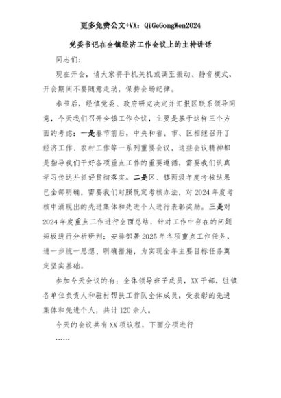 【七哥公文】2025年:党委书记在全镇经济工作会议上的主持讲话+更多免费公文+VX:QiGeGongWen2024+更多免费公文+VX:QiGeGongWen2024
