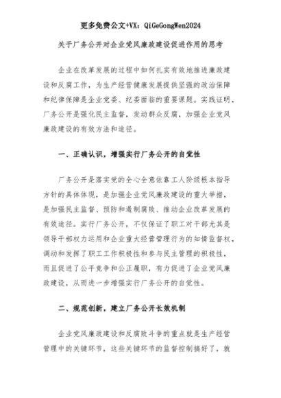 【七哥公文】2025年:关于厂务公开对企业党风廉政建设促进作用的思考+更多免费公文+VX:QiGeGongWen2024+更多免费公文+VX:QiGeGongWen2024