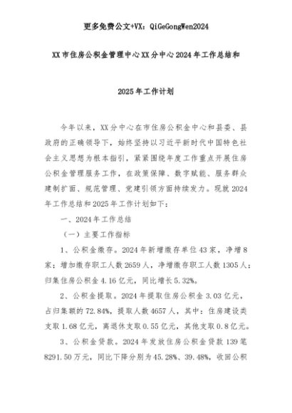 【七哥公文】2025年:XX市住房公积金管理中心XX分中心2024年工作总结和2025年工作计划+更多免费公文+VX:QiGeGongWen2024+更多免费公文+VX:QiGeGongWen2024
