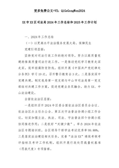 【七哥公文】2025年:XX市XX区司法局2024年工作总结和2025年工作计划+更多免费公文+VX:QiGeGongWen2024+更多免费公文+VX:QiGeGongWen2024
