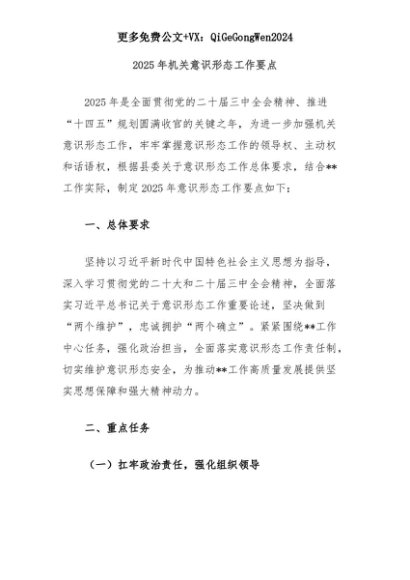 【七哥公文】2025年:2025年机关意识形态工作要点+更多免费公文+VX:QiGeGongWen2024+更多免费公文+VX:QiGeGongWen2024