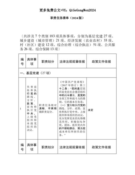 【七哥公文】2025年:乡镇职责任务清单(含法律法规和政策依据2024版)+更多免费公文+VX:QiGeGongWen2024+更多免费公文+VX:QiGeGongWen2024