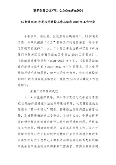 【七哥公文】2025年:XX街道2024年度法治建设工作总结和2025年工作计划+更多免费公文+VX:QiGeGongWen2024+更多免费公文+VX:QiGeGongWen2024