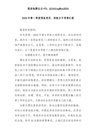 【七哥公文】2025年:2025年第一季度预备党员、积极分子思想汇报+更多免费公文+VX:QiGeGongWen2024+更多免费公文+VX:QiGeGongWen2024
