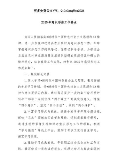【七哥公文】2025年:2025年意识形态工作要点+更多免费公文+VX:QiGeGongWen2024+更多免费公文+VX:QiGeGongWen2024