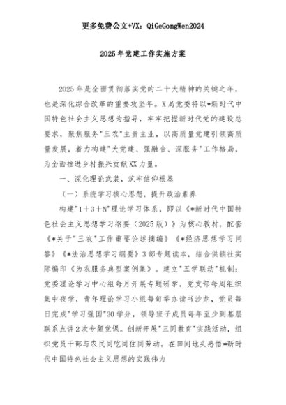 【七哥公文】2025年:2025年党建工作实施方案+更多免费公文+VX:QiGeGongWen2024+更多免费公文+VX:QiGeGongWen2024
