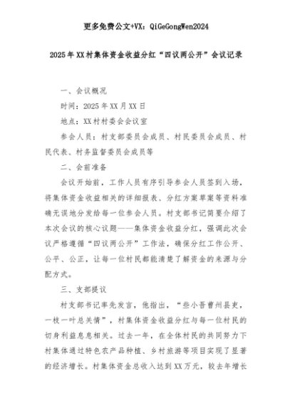 【七哥公文】2025年:2025年XX村集体资金收益分红“四议两公开”会议记录+更多免费公文+VX:QiGeGongWen2024+更多免费公文+VX:QiGeGongWen2024