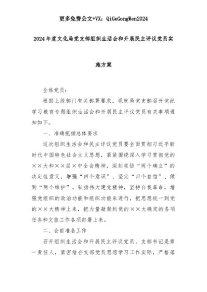 【七哥公文】2025年:2024年度文化局党支部组织生活会和开展民主评议党员实施方案+更多免费公文+VX:QiGeGongWen2024+更多免费公文+VX:QiGeGongWen2024
