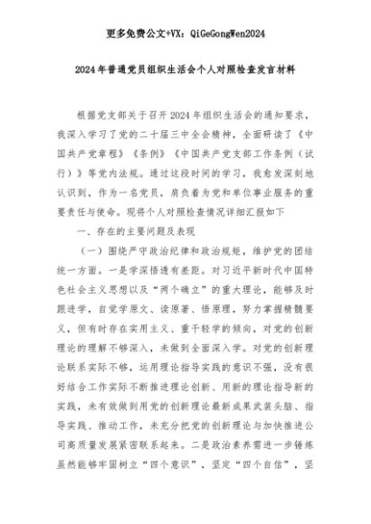 【七哥公文】2025年:2024年普通党员组织生活会个人对照检查发言材料+更多免费公文+VX:QiGeGongWen2024+更多免费公文+VX:QiGeGongWen2024