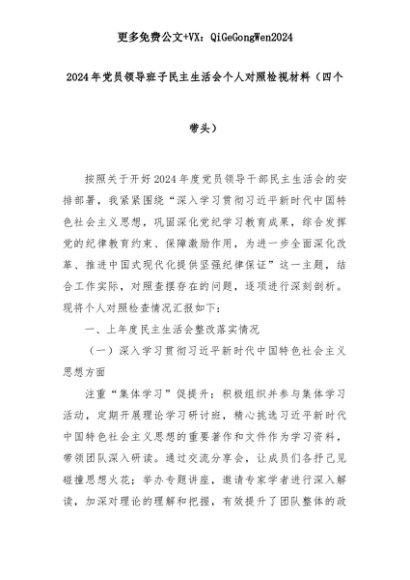 【七哥公文】2025年:2024年党员领导班子民主生活会个人对照检视材料(四个带头)+更多免费公文+VX:QiGeGongWen2024+更多免费公文+VX:QiGeGongWen2024