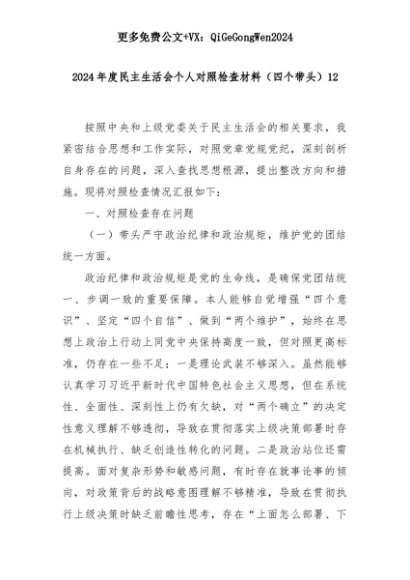 【七哥公文】2025年:2024年度民主生活会个人对照检查材料(四个带头)12+更多免费公文+VX:QiGeGongWen2024+更多免费公文+VX:QiGeGongWen2024