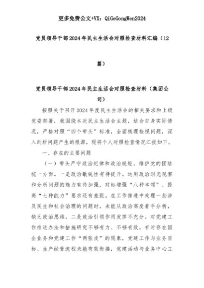 【七哥公文】2025年:(12篇)党员领导干部2024年民主生活会对照检查材料汇编+更多免费公文+VX:QiGeGongWen2024+更多免费公文+VX:QiGeGongWen2024