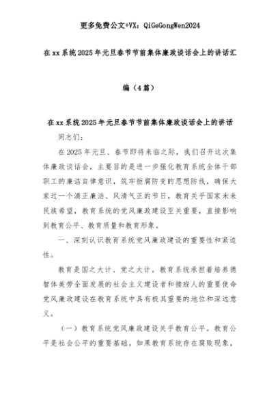 【七哥公文】2025年:(4篇)在xx系统2025年元旦春节节前集体廉政谈话会上的讲话汇编+更多免费公文+VX:QiGeGongWen2024+更多免费公文+VX:QiGeGongWen2024