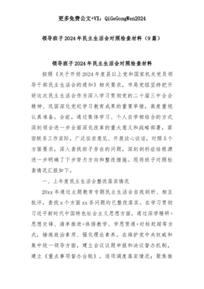【七哥公文】2025年:(9篇)领导班子2024年民主生活会对照检查材料+更多免费公文+VX:QiGeGongWen2024+更多免费公文+VX:QiGeGongWen2024