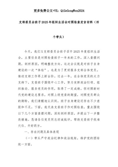 【七哥公文】2025年:支部委员会班子2025年组织生活会对照检查发言材料(四个带头)+更多免费公文+VX:QiGeGongWen2024+更多免费公文+VX:QiGeGongWen2024