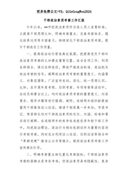 【七哥公文】2025年:干部政治素质考察工作汇报+更多免费公文+VX:QiGeGongWen2024+更多免费公文+VX:QiGeGongWen2024