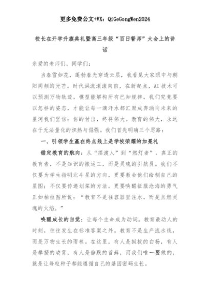 【七哥公文】2025年:校长在开学升旗典礼暨高三年级“百日誓师”大会上的讲话+更多免费公文+VX:QiGeGongWen2024+更多免费公文+VX:QiGeGongWen2024