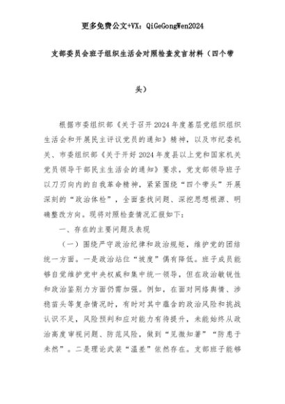 【七哥公文】2025年:支部委员会班子组织生活会对照检查发言材料(四个带头)+更多免费公文+VX:QiGeGongWen2024+更多免费公文+VX:QiGeGongWen2024