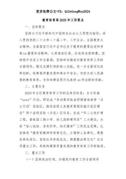 【七哥公文】2025年:教育体育局2025年工作要点+更多免费公文+VX:QiGeGongWen2024+更多免费公文+VX:QiGeGongWen2024