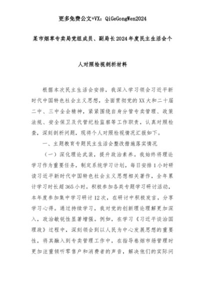 【七哥公文】2025年:某市烟草专卖局党组成员、副局长2024年度民主生活会个人对照检视剖析材料+更多免费公文+VX:QiGeGongWen2024+更多免费公文+VX:QiGeGongWen2024