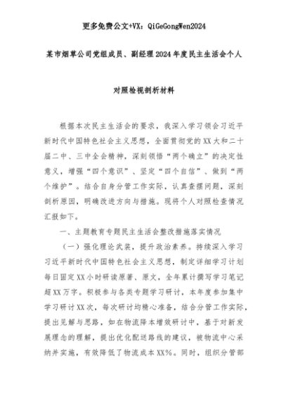 【七哥公文】2025年:某市烟草公司党组成员、副经理2024年度民主生活会个人对照检视剖析材料+更多免费公文+VX:QiGeGongWen2024+更多免费公文+VX:QiGeGongWen2024