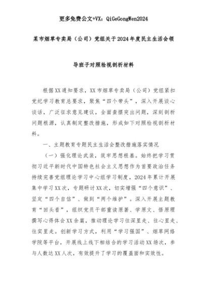 【七哥公文】2025年:某市烟草专卖局(公司)党组关于2024年度民主生活会领导班子对照检视剖析材料+更多免费公文+VX:QiGeGongWen2024+更多免费公文+VX:QiGeGongWen2024