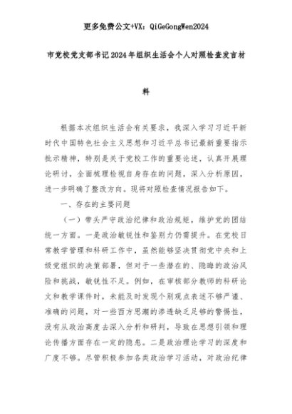 【七哥公文】2025年:市党校党支部书记2024年组织生活会个人对照检查发言材料+更多免费公文+VX:QiGeGongWen2024+更多免费公文+VX:QiGeGongWen2024