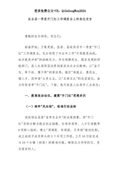 【七哥公文】2025年:在全县一季度开门红工作调度会上的表态发言+更多免费公文+VX:QiGeGongWen2024+更多免费公文+VX:QiGeGongWen2024