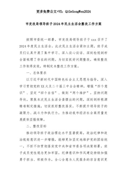 【七哥公文】2025年:市发改局领导班子2024年民主生活会整改工作方案+更多免费公文+VX:QiGeGongWen2024+更多免费公文+VX:QiGeGongWen2024