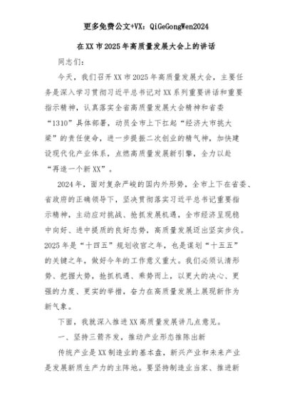 【七哥公文】2025年:在XX市2025年高质量发展大会上的讲话+更多免费公文+VX:QiGeGongWen2024+更多免费公文+VX:QiGeGongWen2024