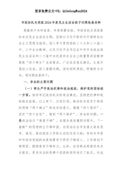 【七哥公文】2025年:市政协机关党组2024年度民主生活会班子对照检查材料+更多免费公文+VX:QiGeGongWen2024+更多免费公文+VX:QiGeGongWen2024