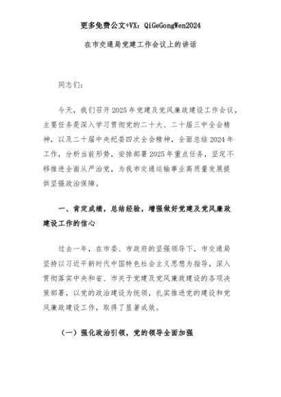 【七哥公文】2025年:在市交通局党建工作会议上的讲话+更多免费公文+VX:QiGeGongWen2024+更多免费公文+VX:QiGeGongWen2024