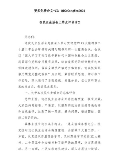 【七哥公文】2025年:在民主生活会上的点评讲话2+更多免费公文+VX:QiGeGongWen2024+更多免费公文+VX:QiGeGongWen2024