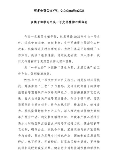 【七哥公文】2025年:乡镇干部学习中央一号文件精神心得体会+更多免费公文+VX:QiGeGongWen2024+更多免费公文+VX:QiGeGongWen2024
