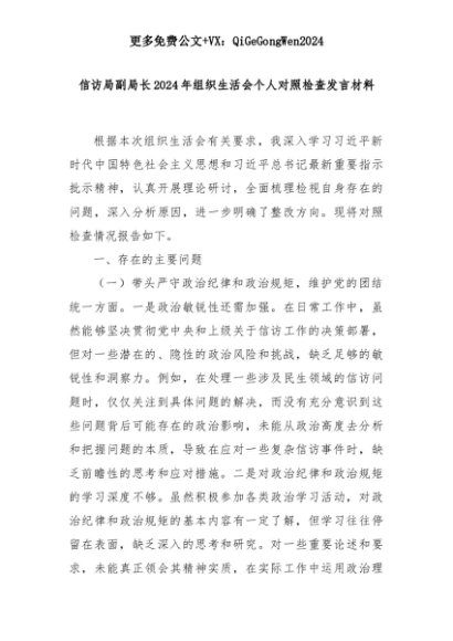 【七哥公文】2025年:信访局副局长2024年组织生活会个人对照检查发言材料+更多免费公文+VX:QiGeGongWen2024+更多免费公文+VX:QiGeGongWen2024