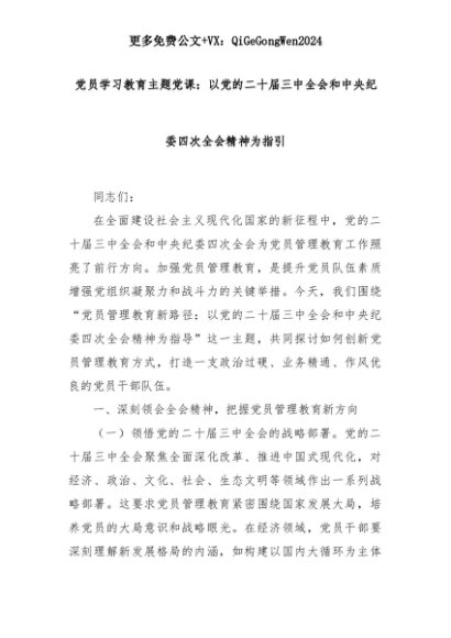 【七哥公文】2025年:党员学习教育主题党课:以党的二十届三中全会和中央纪委四次全会精神为指引+更多免费公文+VX:QiGeGongWen2024+更多免费公文+VX:QiGeGongWen2024