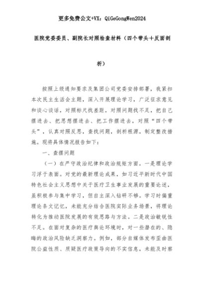 【七哥公文】2025年:医院党委委员、副院长对照检查材料(四个带头+反面剖析)+更多免费公文+VX:QiGeGongWen2024+更多免费公文+VX:QiGeGongWen2024