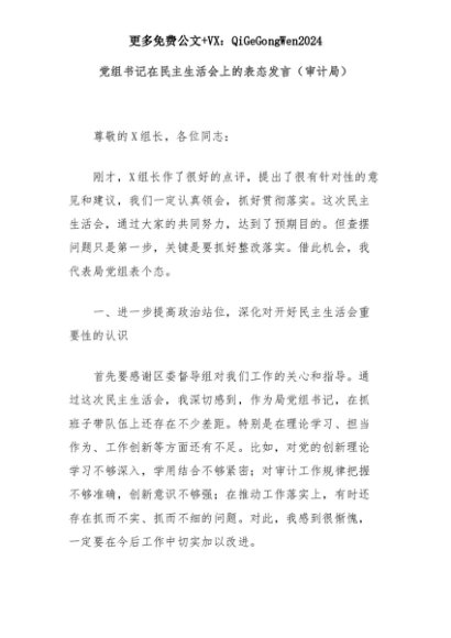 【七哥公文】2025年:党组书记在民主生活会上的表态发言(审计局)+更多免费公文+VX:QiGeGongWen2024+更多免费公文+VX:QiGeGongWen2024
