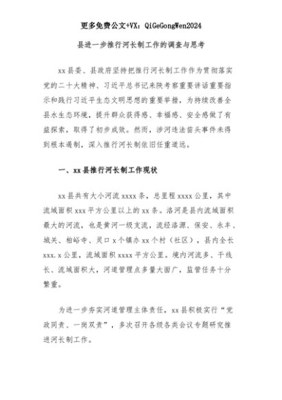 【七哥公文】2025年:县进一步推行河长制工作的调查与思考+更多免费公文+VX:QiGeGongWen2024+更多免费公文+VX:QiGeGongWen2024