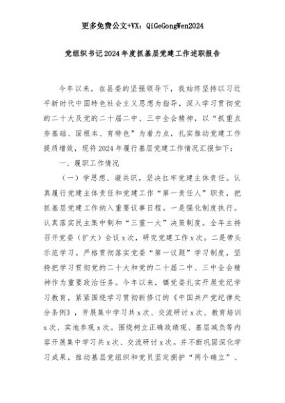 【七哥公文】2025年:党组织书记2024年度抓基层党建工作述职报告+更多免费公文+VX:QiGeGongWen2024+更多免费公文+VX:QiGeGongWen2024
