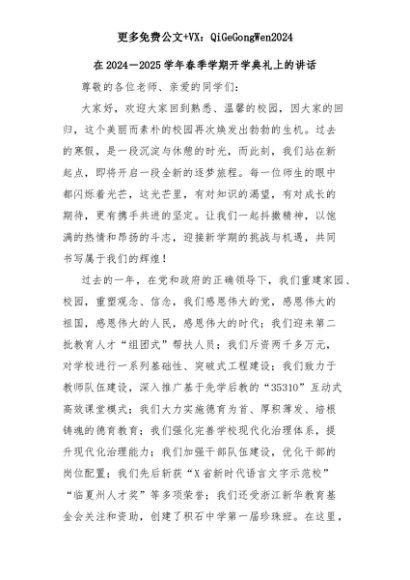 【七哥公文】2025年:在2024-2025学年春季学期开学典礼上的讲话+更多免费公文+VX:QiGeGongWen2024+更多免费公文+VX:QiGeGongWen2024