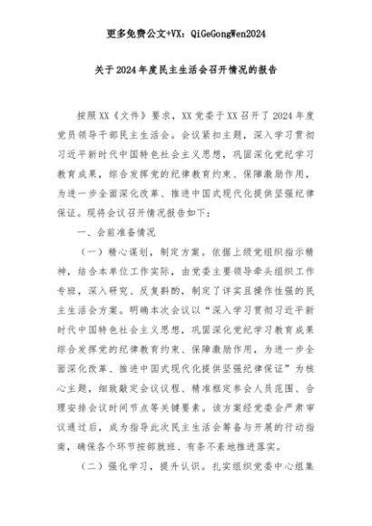 【七哥公文】2025年:关于2024年度民主生活会召开情况的报告+更多免费公文+VX:QiGeGongWen2024+更多免费公文+VX:QiGeGongWen2024