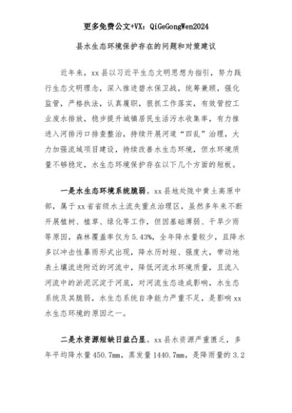 【七哥公文】2025年:县水生态环境保护存在的问题和对策建议+更多免费公文+VX:QiGeGongWen2024+更多免费公文+VX:QiGeGongWen2024
