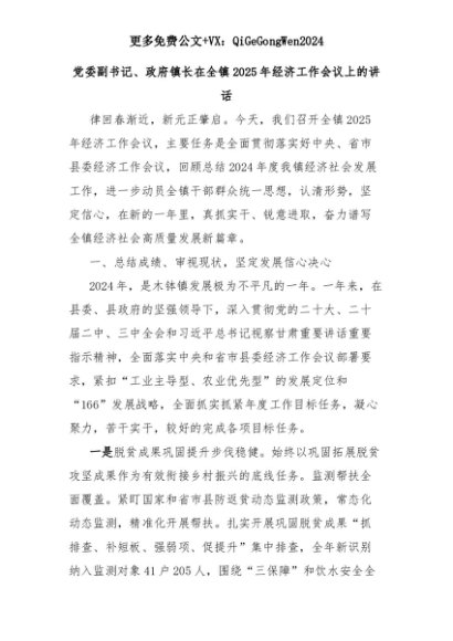 【七哥公文】2025年:党委副书记、政府镇长在全镇2025年经济工作会议上的讲话+更多免费公文+VX:QiGeGongWen2024+更多免费公文+VX:QiGeGongWen2024