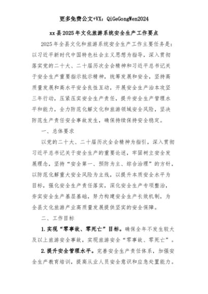 【七哥公文】2025年:xx县2025年文化旅游系统安全生产工作要点+更多免费公文+VX:QiGeGongWen2024+更多免费公文+VX:QiGeGongWen2024