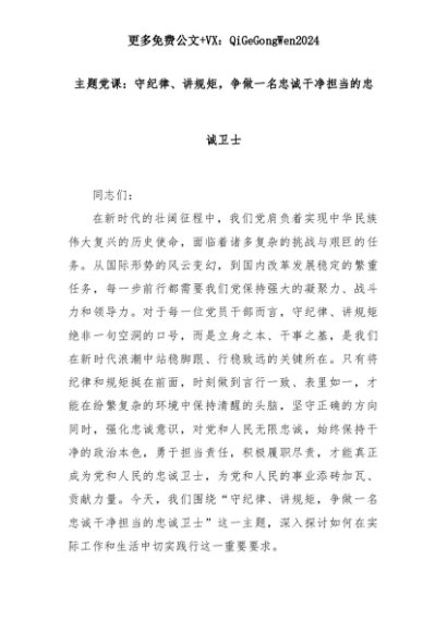 【七哥公文】2025年:主题党课:守纪律、讲规矩,争做一名忠诚干净担当的忠诚卫士+更多免费公文+VX:QiGeGongWen2024+更多免费公文+VX:QiGeGongWen2024